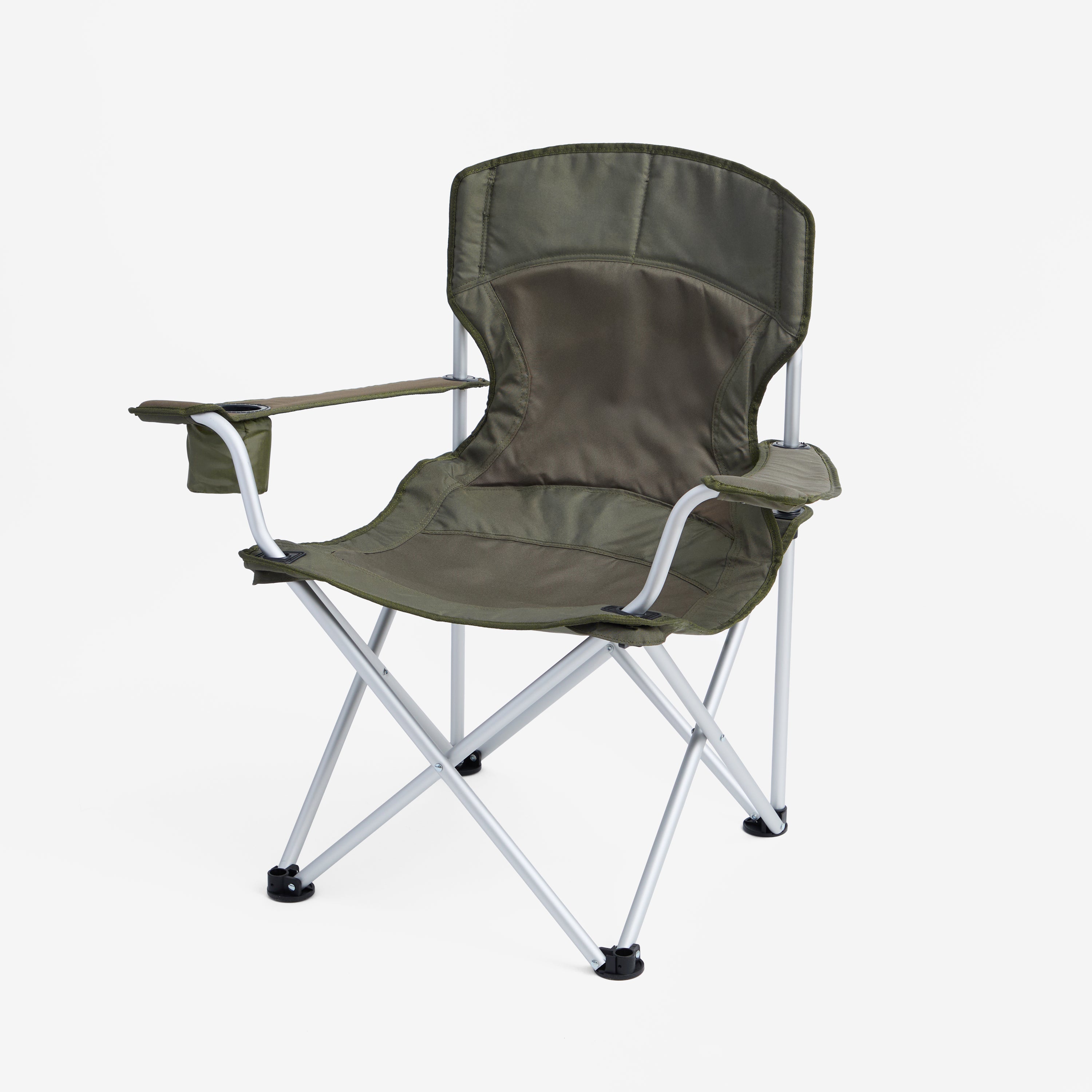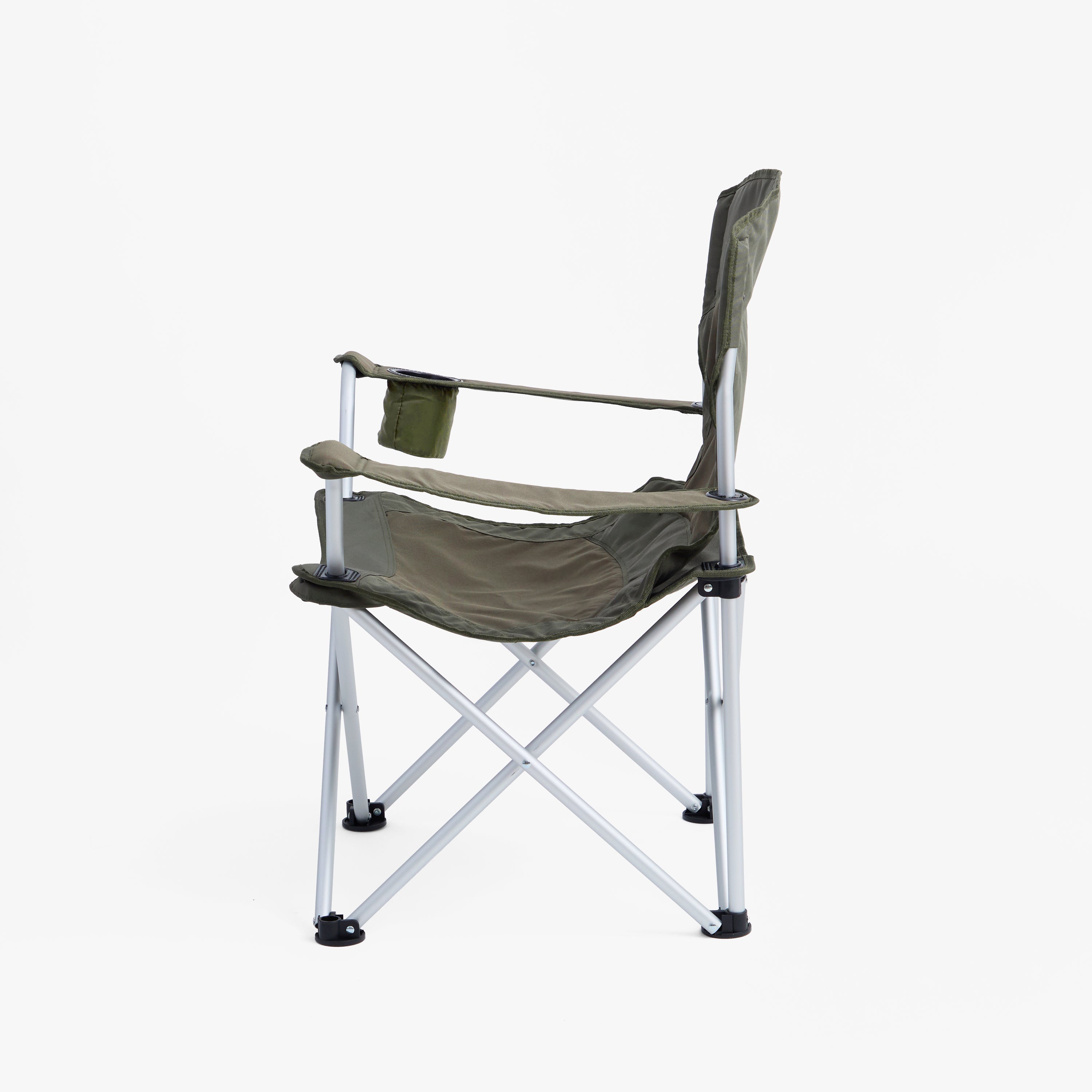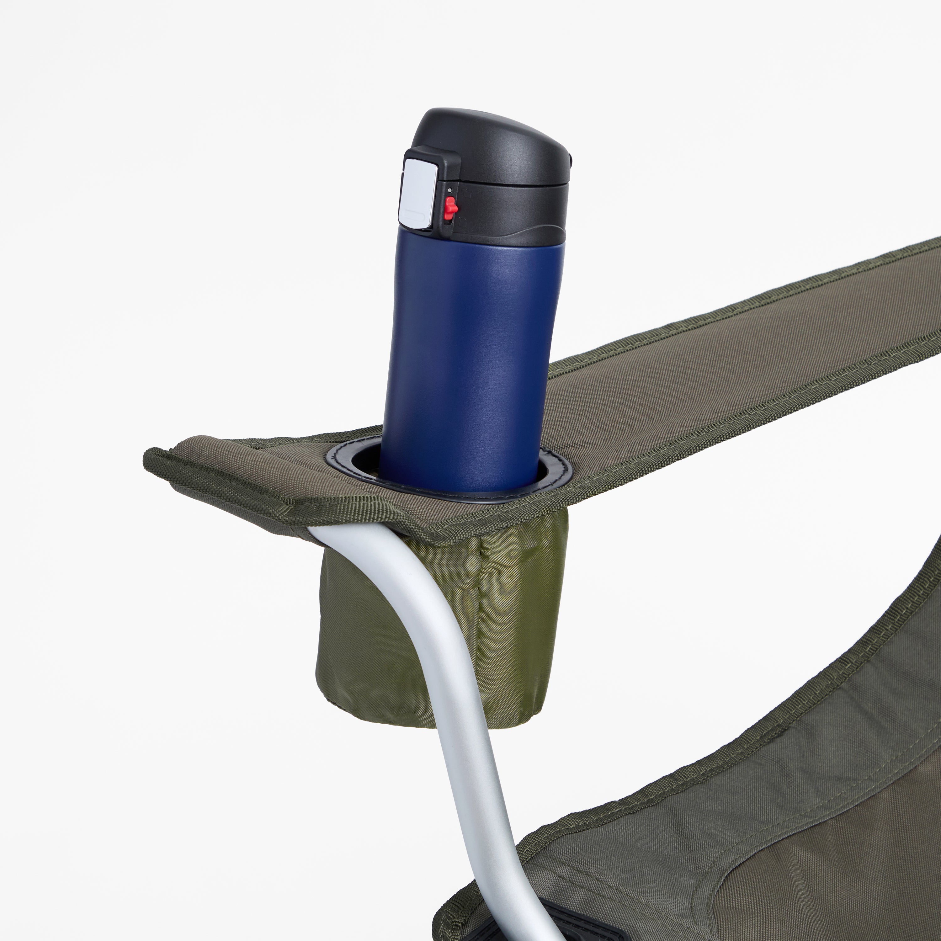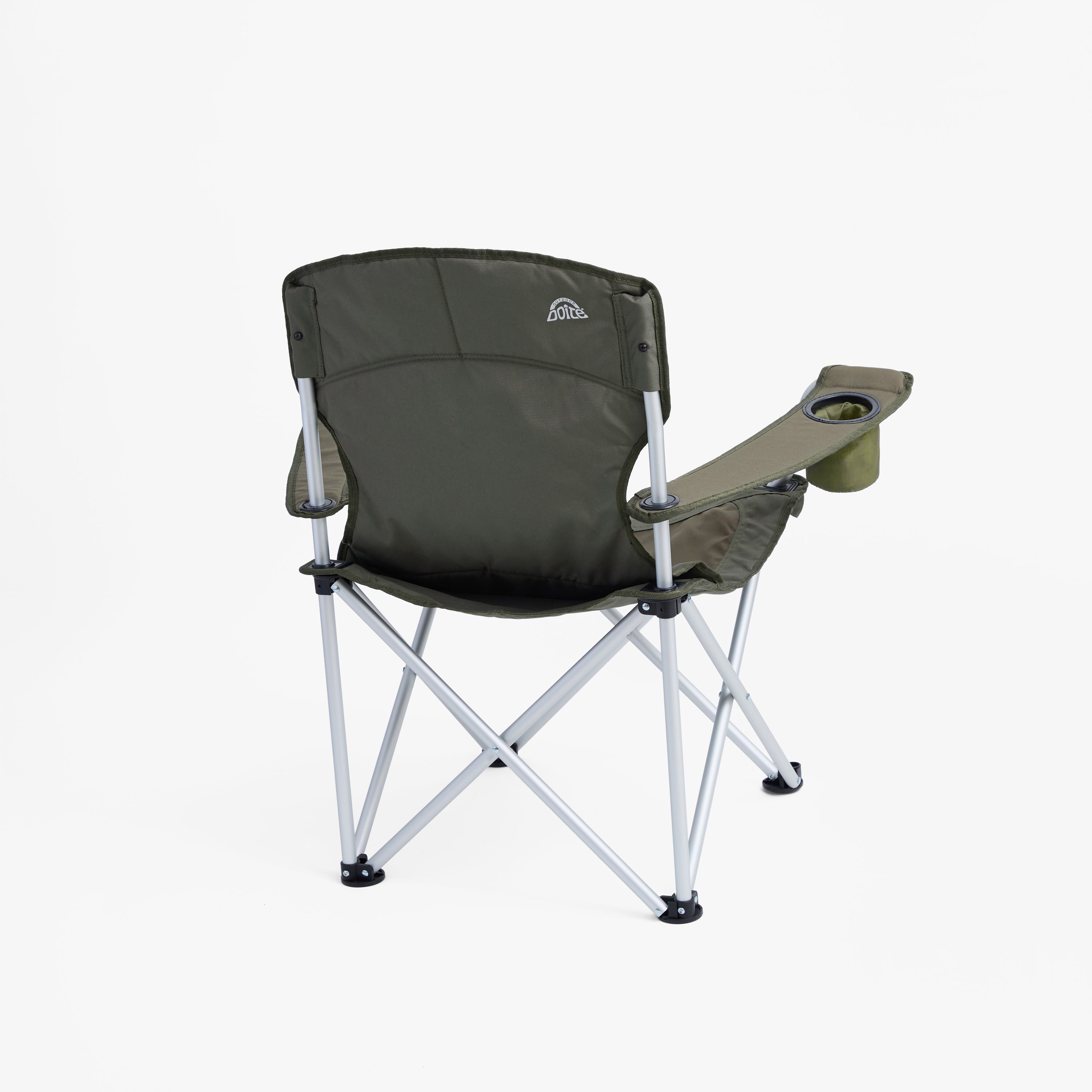 Silla de camping plegable hecha de aluminio y tela. Tiene porta vaso y apoya brazos. Este modelo incluye un bolso de transporte. PESO: 2,5 Kg.