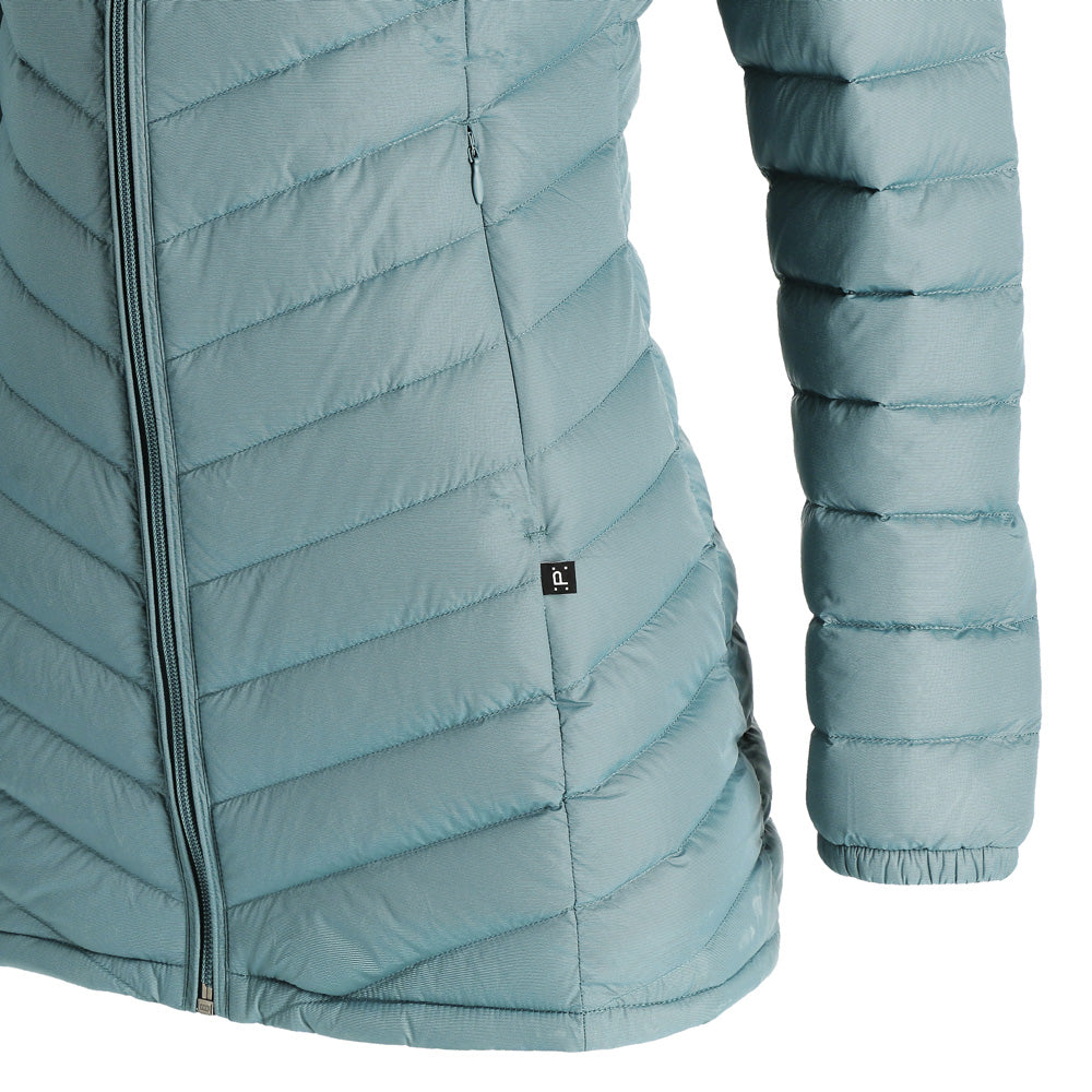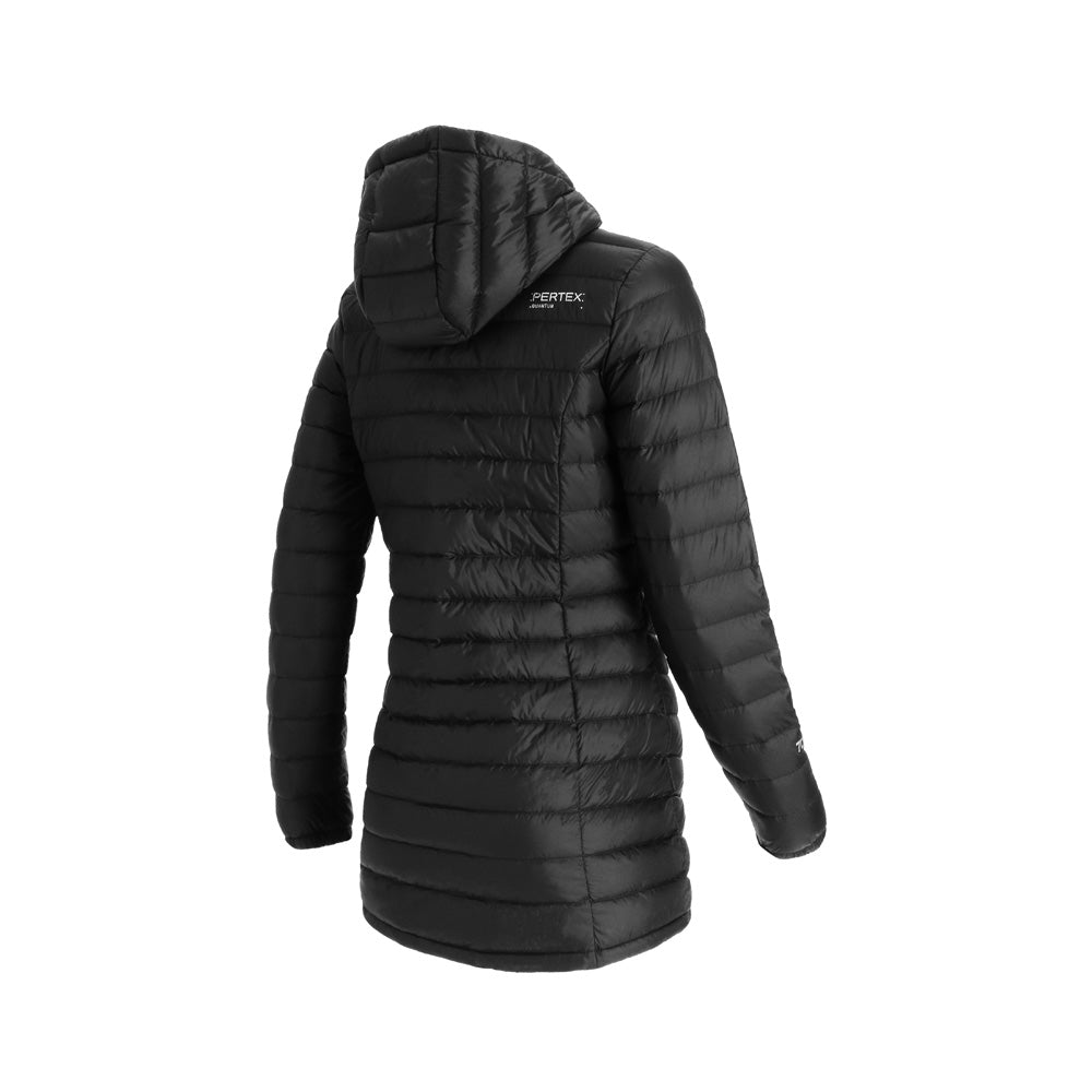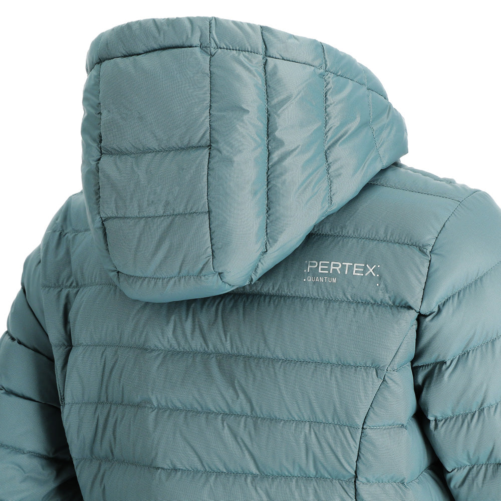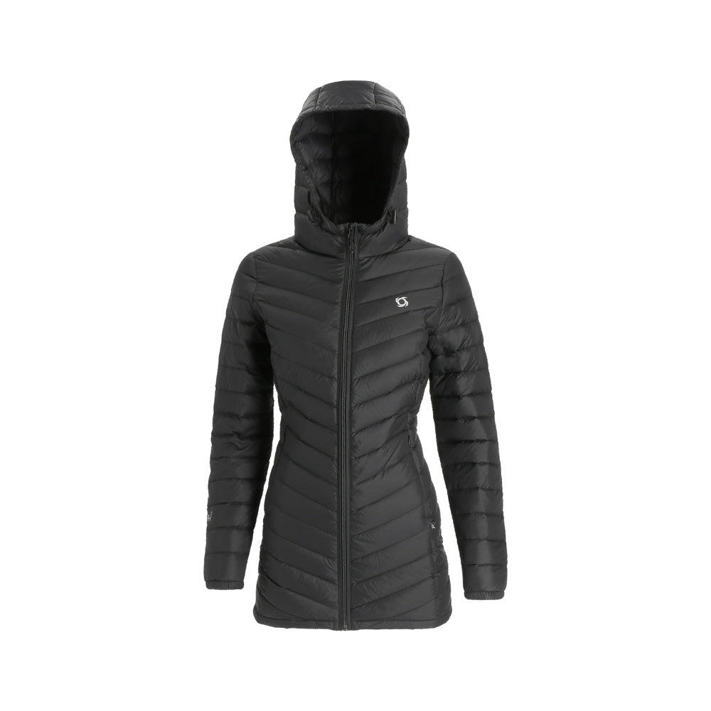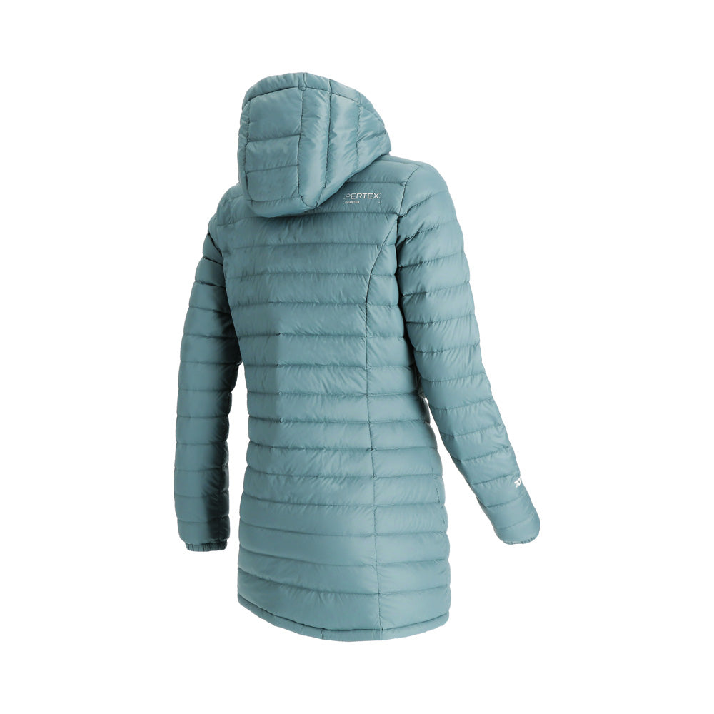 El abrigo de pluma con gorro Aken para mujer combina elegancia y funcionalidad. Confeccionado en tela Pertex Quantum nylon 20D y relleno de plumas de pato de 700FP, es ligero y cálido. Su diseño compactable lo hace ideal para viajar, con bolsa de transporte incluida. Presenta gorro incluido no desmontable, cierre completo, bolsillos de manos con cierre para guardar todos tus objetos de forma segura, su largo que cubre las caderas para una protección completa. Ajuste regular para mayor comodidad.
