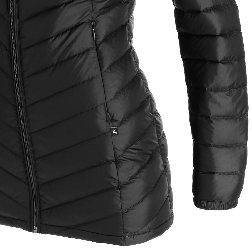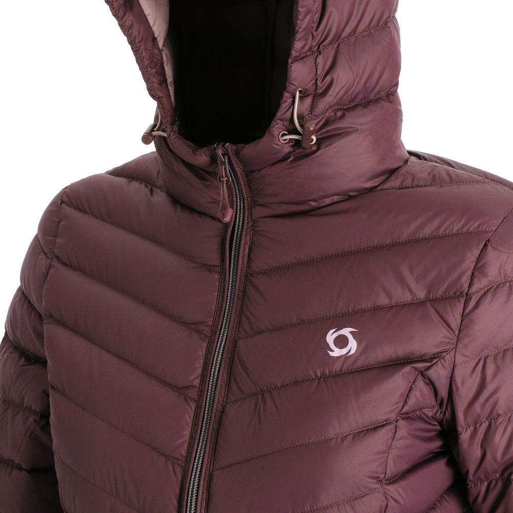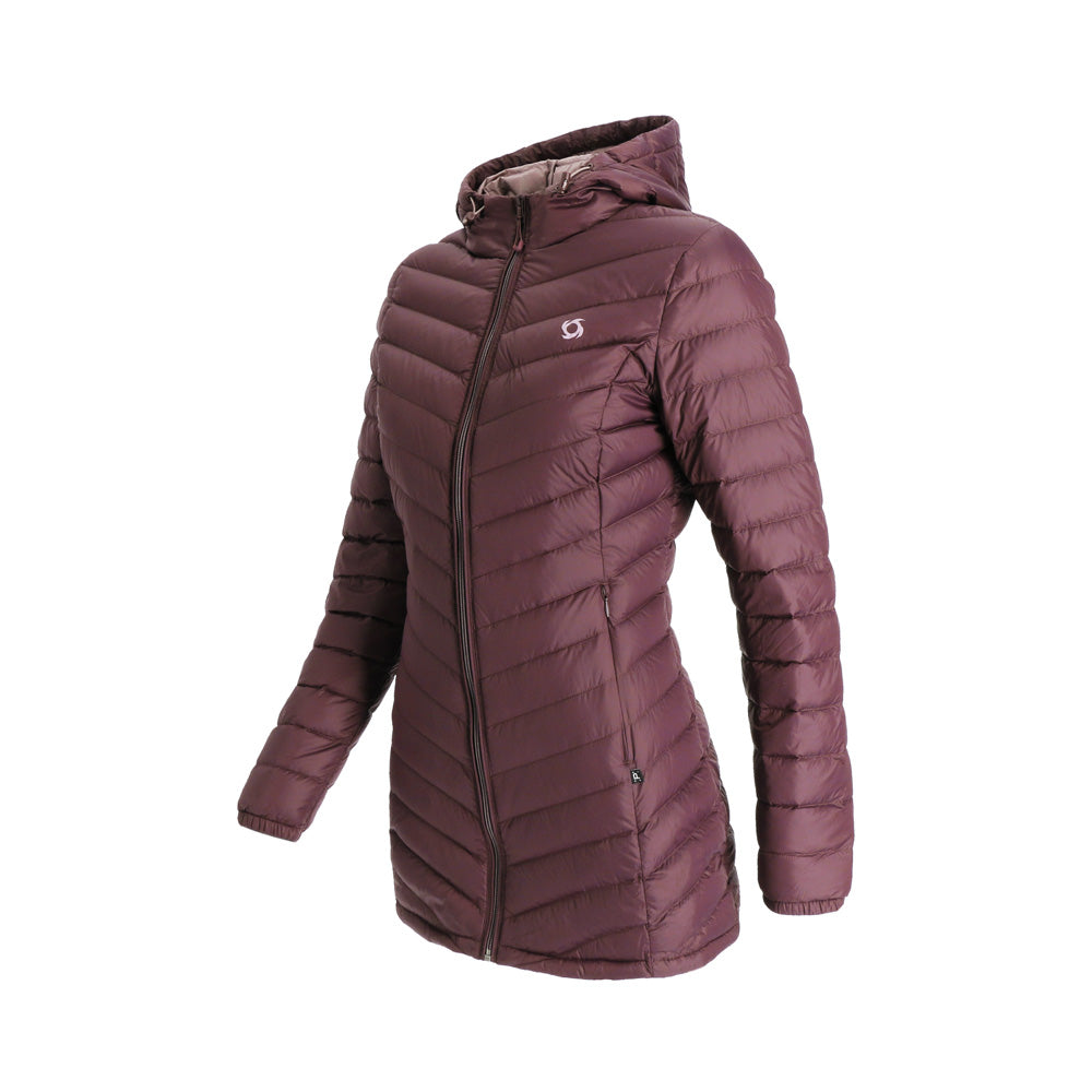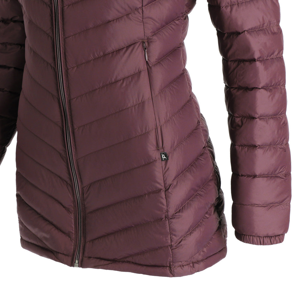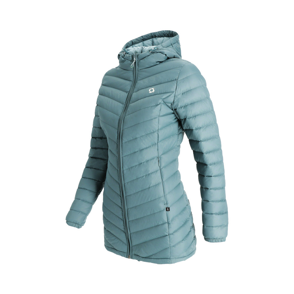 El abrigo de pluma con gorro Aken para mujer combina elegancia y funcionalidad. Confeccionado en tela Pertex Quantum nylon 20D y relleno de plumas de pato de 700FP, es ligero y cálido. Su diseño compactable lo hace ideal para viajar, con bolsa de transporte incluida. Presenta gorro incluido no desmontable, cierre completo, bolsillos de manos con cierre para guardar todos tus objetos de forma segura, su largo que cubre las caderas para una protección completa. Ajuste regular para mayor comodidad.