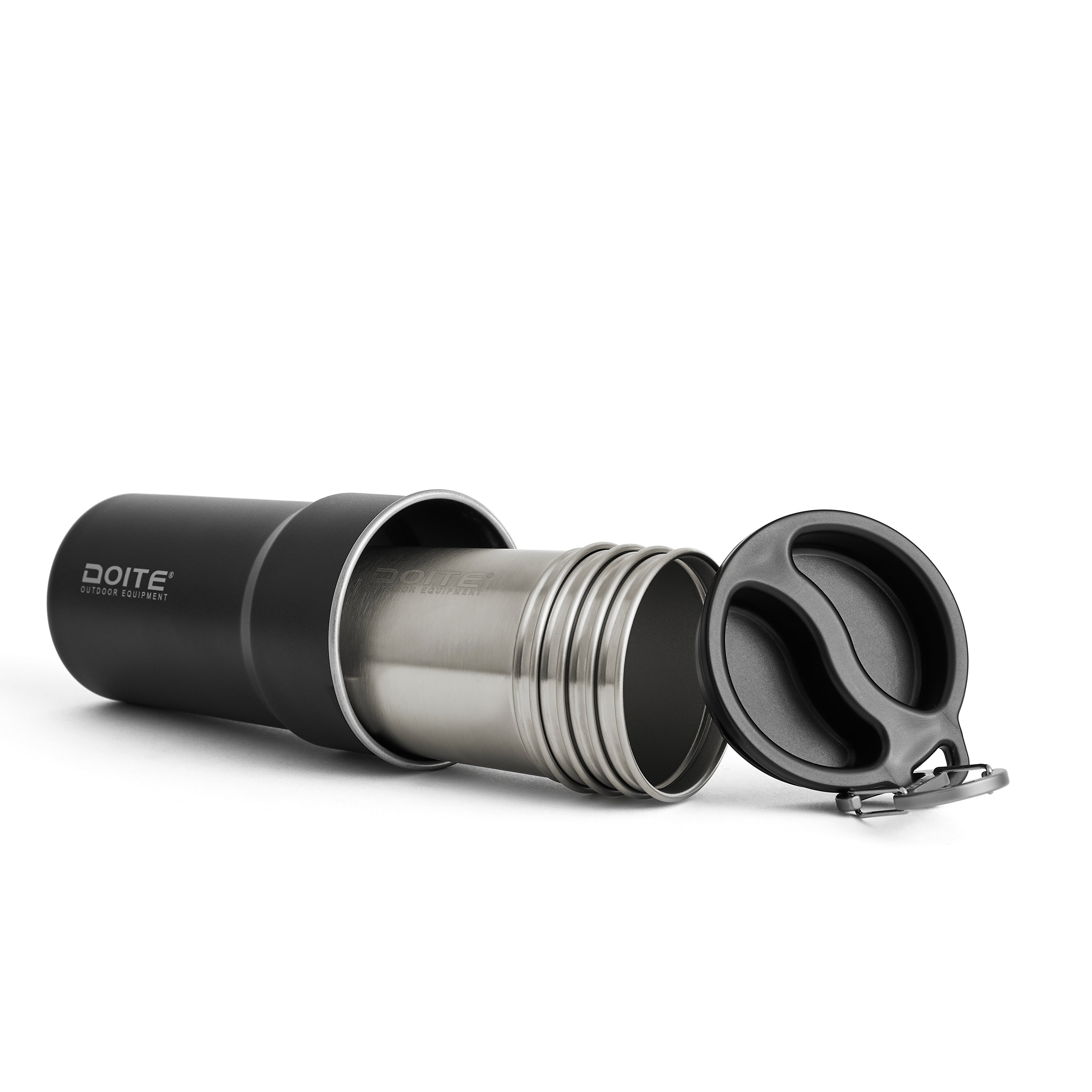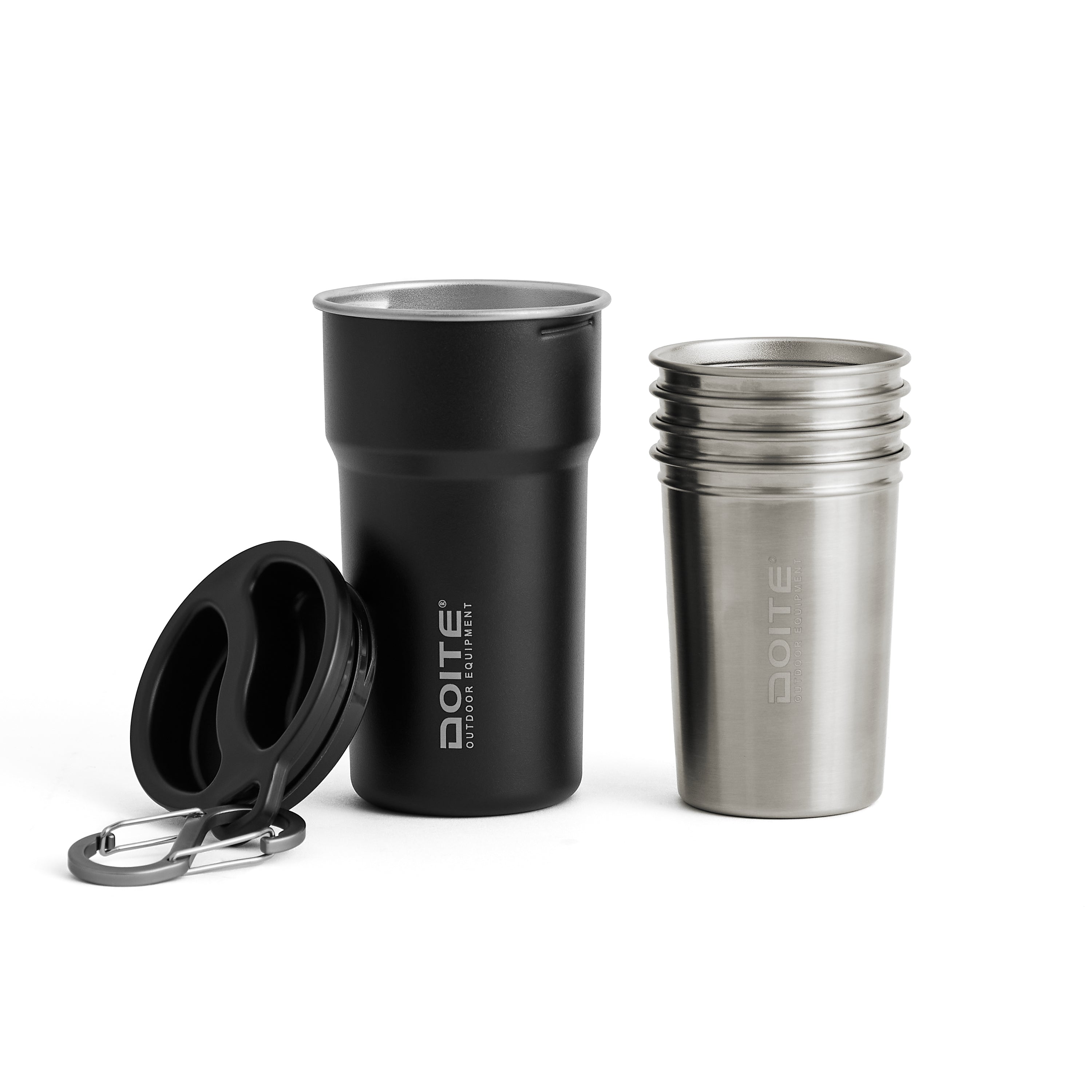 Set de 5 vasos con tapa Doite, práctico, compacto y diseñado para acompañarte en todas tus aventuras. Incluye 4 vasos de 200 ml apilables dentro de un vaso grande de 380 ml, junto con una tapa protectora y mosquetón para colgar en tu mochila. Fabricados en acero inoxidable resistente y plástico libre de BPA, son ideales para camping, picnic o viajes outdoor.